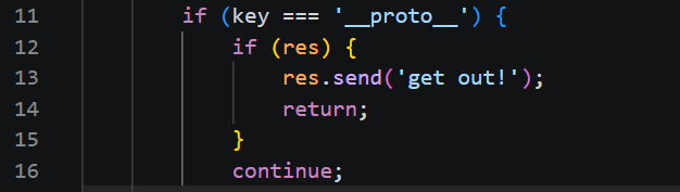 开发者显然知道 __proto__ 常常和原型污染有关,所以他写了个“黑名单”: