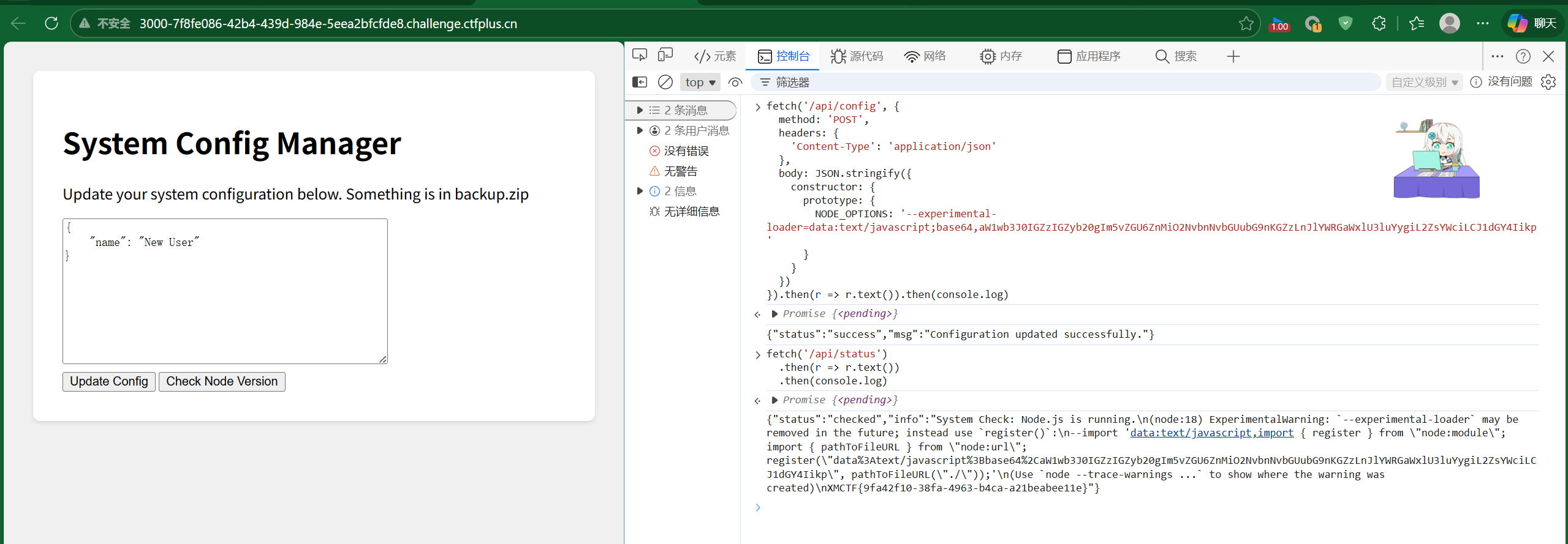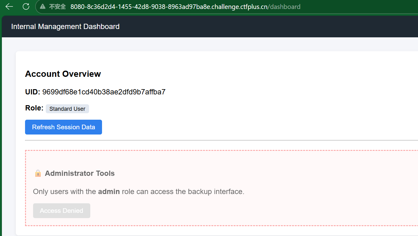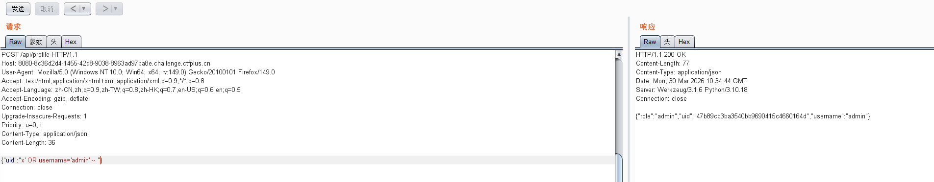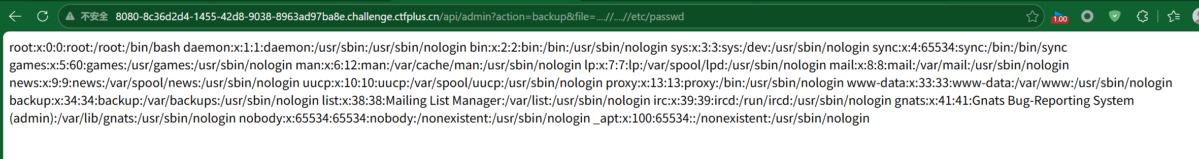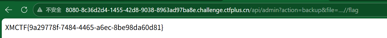 /api/profile 存在未鉴权 SQL 注入,可直接泄露管理员资料。用该 UID 登录后可访问 /api/admin?action=backup&file=…,直接拿到flag