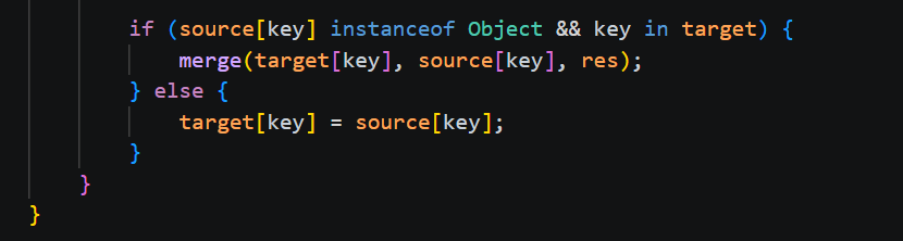 由于 key in target 会沿原型链找,config 上虽然没有自有属性 constructor,但它能从 Object.prototype 继承到,所以可以一路递归到 Object.prototype,形成原型污染。