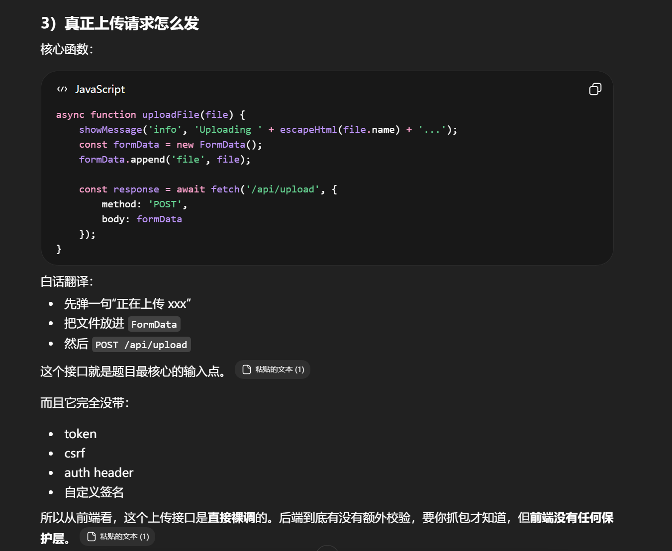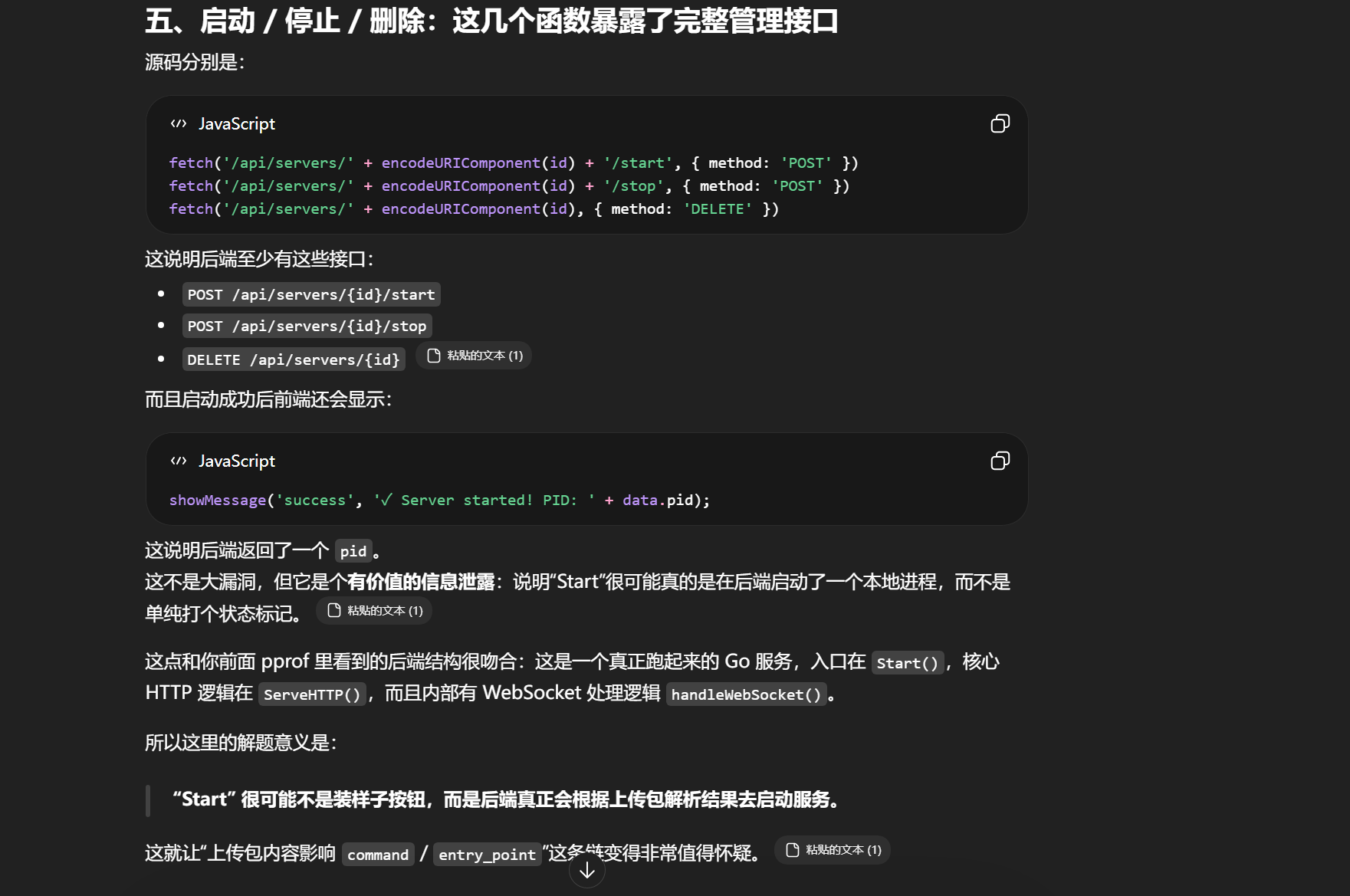 分析前端源码,这页前端本质上就是一个“上传包 → 查看服务列表 → 启停/删除服务 → 查看服务详情”的管理面板;真正有价值的攻击面几乎都集中在它调用的那几个 /api/* 接口上,而不是页面样式本身。