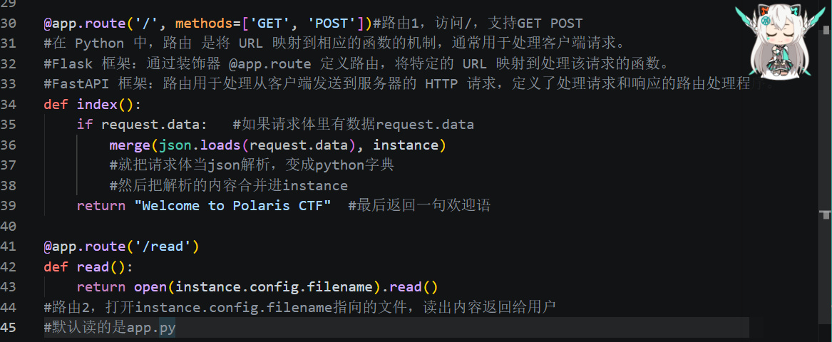 - `GET /read` 会执行 `open(instance.config.filename).read()`,形成任意文件读取
